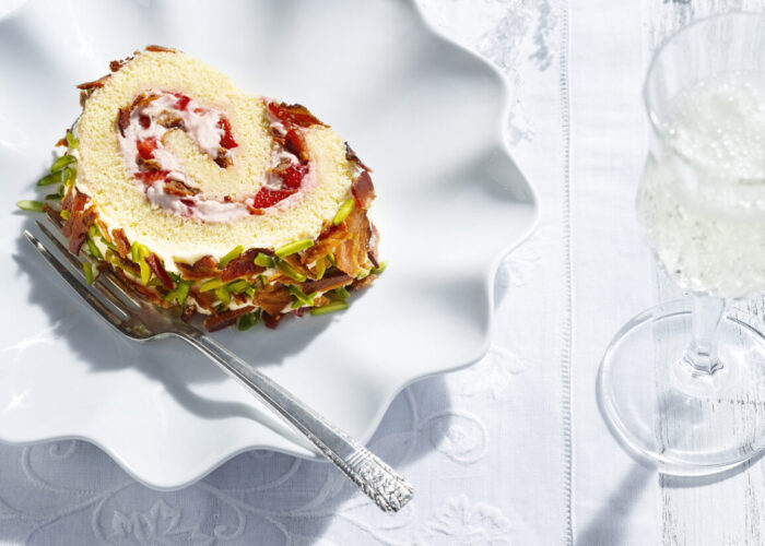 7. Unroll the cooled cake and spread the mascarpone cream and strawberry purée mixture over the entire surface. Sprinkle with half the bacon. Roll the cake and arrange on a serving dish. Slice ends at an angle. Using a spatula, ice the rolled cake with reserved mascarpone cream. Sprinkle the top with pistachios and remaining bacon.