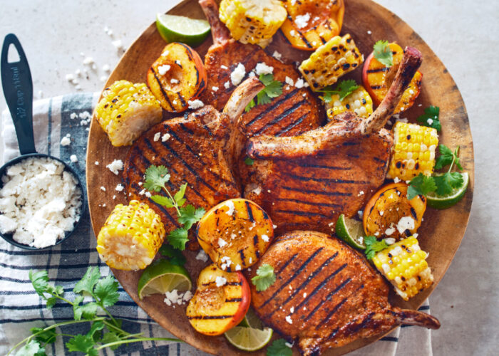 - Serve pork chops with grilled corn and peaches. Sprinkle with reserved spice mixture, cilantro and cheese. Serve with lime wedges and arugula salad, if desired.