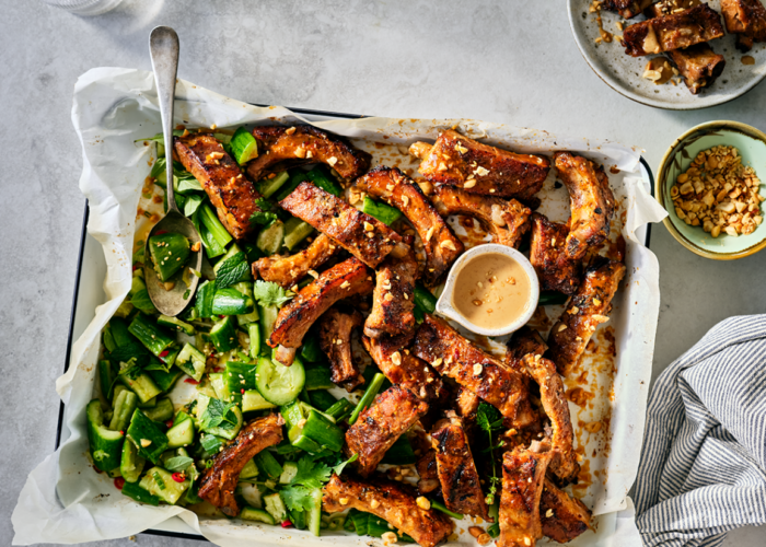 3. Servir les côtes levées avec la salade de concombres. Parsemer les côtes levées d’arachides ou de graines de sésame et d’herbes fraîches. Accompagner de riz au jasmin et de la sauce crémeuse aux arachides et au noix de coco, si désiré.